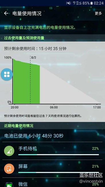 - 自從4月份買的S7到現(xiàn)在也用了快4個月了,開始電池還比較耐用,但自從更新之后耗電量就開始增加,尤其是這次PG2,實在無法忍受??磦€網(wǎng)頁手機都會發(fā)熱,大概算了下3分鐘1%的掉(之前沒有過),待機一夜大概用15%電量。以為是中了病毒(因為之前點開過假紅包),就恢復(fù)出廠了。問題依然沒有解決,于是就開始找原因,電池耗電排行Android系統(tǒng)比屏幕耗電還高,明顯不正常。 什么一鍵優(yōu)化,后臺清理,自啟動等一些常規(guī)方法都用過,就不說了。既然是系統(tǒng)耗電,那就在設(shè)置里找找關(guān)于系統(tǒng)設(shè)置的問題,終于找到了原因,先上圖坡度已明顯放緩,如果純待機的話估計1小時掉1%沒問題,我的息屏提醒開著,而且沒有用省電