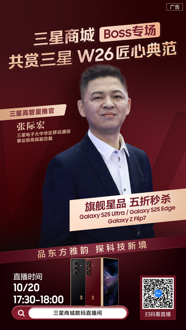 - ? 品東方雅韻 與三星高管共探新境 ?? 邀您一起共賞三星W26匠心典范 ?? 三星商城Boss專場即將開啟 ?? 5折秒殺與直播專場福利等你來拿! ?? 直播時間 & 精彩活動敬請關注~ ? 10月20日 周一17:30-18:00 三星高管星推官 · 張際宏 5折秒殺Galaxy S25 Ultra Galaxy Z Flip7、Galaxy S25 Edge ? 10月22日 周三18:00-19:00 三星高管星推官 · 劉輝 5折秒殺Galaxy S25 Ultra Galaxy Tab S10 Lite Galaxy Watch Ultra(2025)