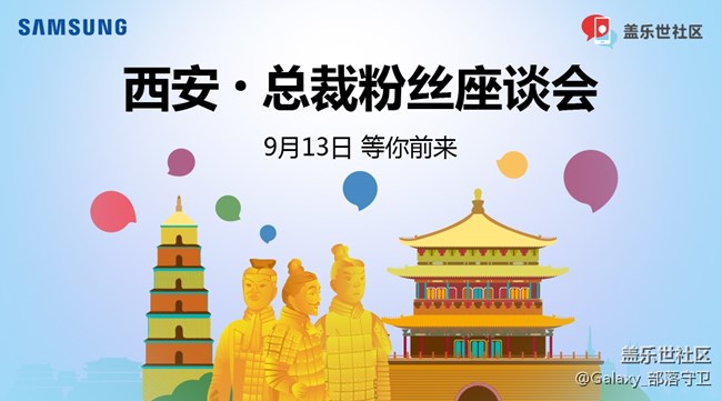 - 小伙伴們,在這秋高氣爽的日子。三星電子移動(dòng)事業(yè)部總裁——高東真先生即將到訪西安! 不知道西安的小伙伴們有沒有感到驚喜!2018年9月13日 古都西安粉絲們將有機(jī)會(huì)與高東真先生 進(jìn)行一場零距離的精彩座談會(huì)。小伙伴們趕快動(dòng)動(dòng)手指踴躍報(bào)名吧,名額有限,我們等你來!【招募時(shí)間】即日起-2018年9月7日【時(shí)間地點(diǎn)】9月13日 (周四) 下午活動(dòng)地點(diǎn)及到場時(shí)間 報(bào)名成功后短信通知 【招募對象及名額】全國星部落 粉絲100人【報(bào)名費(fèi)用】完全免費(fèi)【活動(dòng)內(nèi)容】現(xiàn)場的蓋樂世社區(qū)粉絲與三星高社長進(jìn)行互動(dòng),零距離面對面交流討論!【報(bào)名方式】請按照下方報(bào)名格式填寫內(nèi)容【特殊禮品】凡報(bào)名成功的用戶,活動(dòng)結(jié)束后即可領(lǐng)取價(jià)