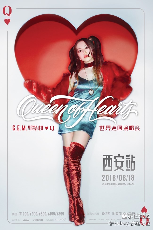 - 【字多不看,直接下拉查看活動(dòng)參與方式】8月18日,鄧紫棋2018 Queen of Hearts 世界巡回演唱會(huì)將會(huì)來(lái)到我們的古都西安。自從啟動(dòng)世界巡演以來(lái),鄧紫棋以獨(dú)具特色的聲音和極佳的舞臺(tái)表現(xiàn)力,震撼了中國(guó)丶星馬丶澳大利亞等國(guó)家共25萬(wàn)歌迷,臺(tái)北站門(mén)票更是3分鐘秒殺,兩度加場(chǎng)一票難求。 此次演唱會(huì)由曾與Ed Sheeran丶Muse等巨星合作的世界頂尖制作公司MOMENT FACTORY打造舞臺(tái),夢(mèng)幻的移動(dòng)城堡丶絢麗的視覺(jué)效果,令人目不暇給。曾為麥當(dāng)娜設(shè)計(jì)舞步的Kevin Maher亦受邀擔(dān)任編舞師,從來(lái)自世界各地的上百位舞者中選中了8名伴舞,國(guó)際化手筆的投入帶來(lái)璀璨難忘的視聽(tīng)享受。 【