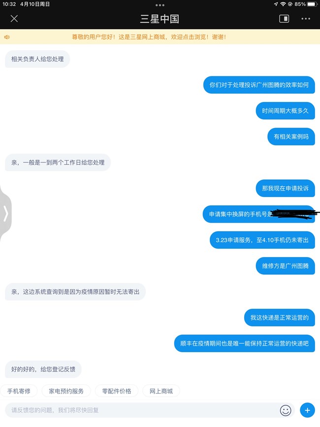 4.9也是跟三星客服說(shuō)了問(wèn)題,也是回應(yīng)24h內(nèi)給我回電,仍然沒(méi)有收到來(lái)電,無(wú)語(yǔ)了??,不是很能接受疫情原因無(wú)法發(fā)貨這個(gè)理由,至少也得有人來(lái)聯(lián)系我溝通一下吧,今天找三星又說(shuō)下,感覺(jué)并沒(méi)有把我的投訴當(dāng)回事。