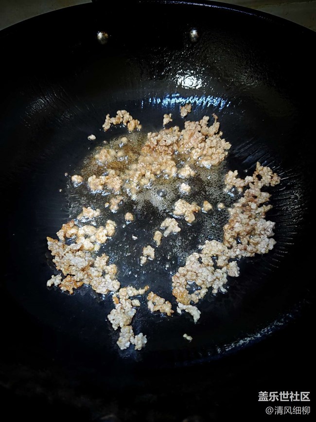 鍋里放入底油10克,鍋里冒煙后小火,放入豬肉末煸炒兩分鐘,肉沫均勻滑散變深*
