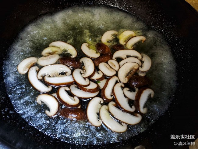 先加入蒜米、蔥花,再倒進(jìn)香菇翻炒兩分鐘