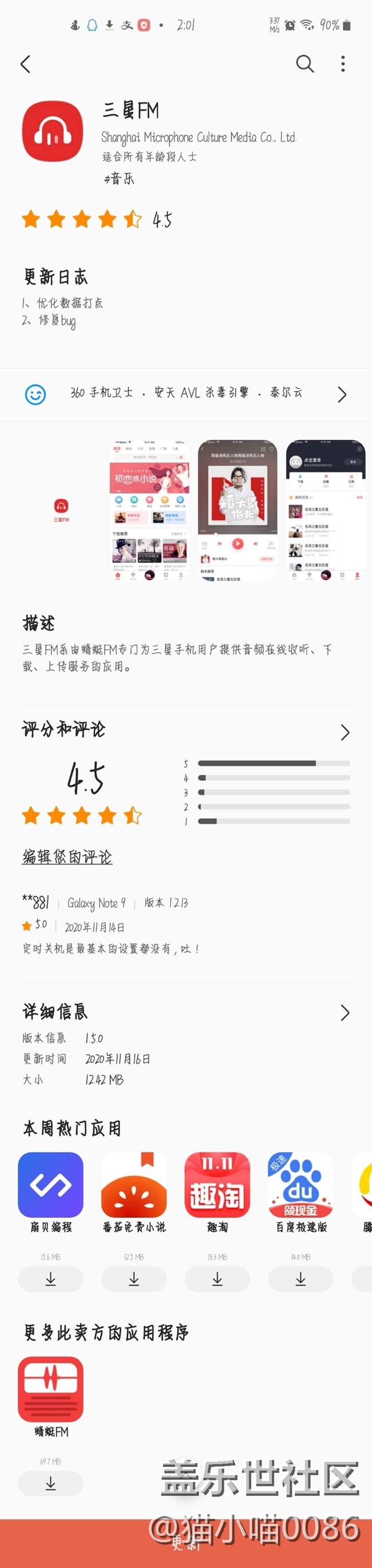 看到很多人因?yàn)檫@個(gè)應(yīng)用給差評(píng)并且也在罵三星,特意給大家解釋一下:這個(gè)叫"三星FM"的軟件,并不是三星公司開發(fā)的,只是套了三星的名字,不建議大家使用。其原型是蜻蜓FM,如果真的想用的話,可以去搜蜻蜓FM或者喜馬拉雅。