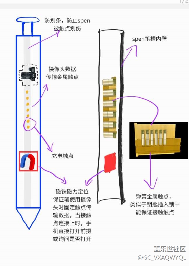 把前攝像頭裝在spen 上面,因為無線傳輸圖傳是不可能的,那就改為觸點吧[受虐滑稽]像數(shù)據(jù)線一樣就ok 了,把spen 拔出3分之一時,用汝磁鐵定位,有彈簧(類似于鑰匙插入鎖頭一樣)金屬銅觸點,讓手機與spen連接傳輸相機的數(shù)據(jù),就像U*攝像頭一樣[喵喵]也可以用于spen 充電,像手環(huán)充電一樣,磁吸附銅觸點,就可以把spen 的無線充電模塊去掉了[受虐滑稽]我覺得這個方案真的可以實現(xiàn)[笑哭]你覺得呢