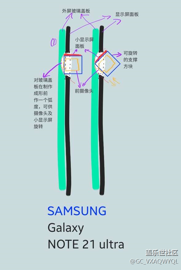 通過旋轉(zhuǎn)90度來切換攝像頭和小顯示面板,但這個還需要把外屏玻璃拋開做一個弧度,才可以讓支撐方塊旋轉(zhuǎn)