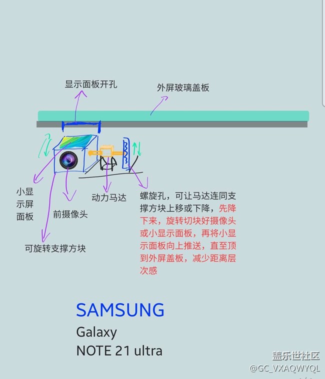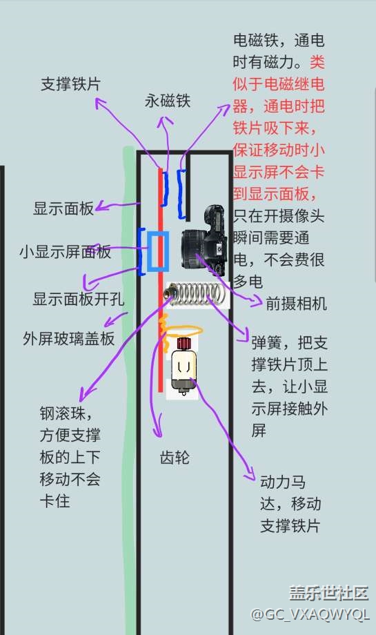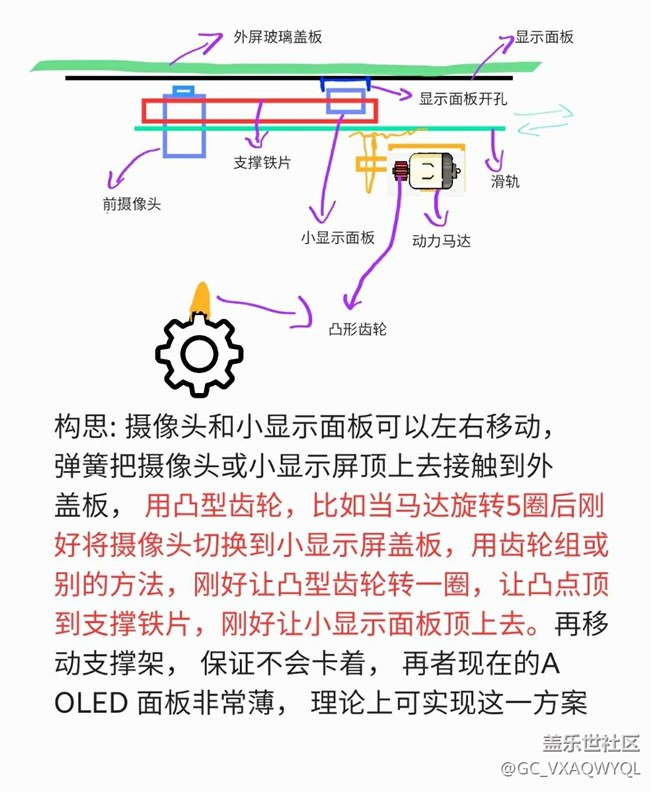 構(gòu)思: 攝像頭和小顯示面板可以在滑軌內(nèi)左右移動, 彈簧把攝像頭或小顯示屏頂上去接觸到外蓋板, 用凸型齒輪,比如當馬達旋轉(zhuǎn)5圈后剛好將攝像頭切換到小顯示屏蓋板,用齒輪組或別的方法,剛好讓凸型齒輪轉(zhuǎn)一圈,讓凸點頂?shù)街舞F片,剛好讓小顯示面板頂上去。再移動支撐架, 保證不會卡著, 再者現(xiàn)在的A OLED 面板非常薄, 理論上可實現(xiàn)這一方案