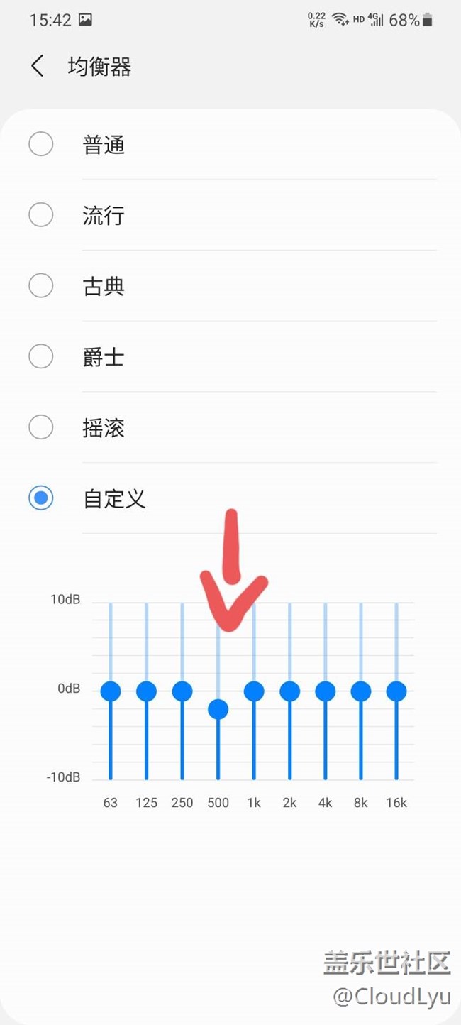 在推特看到一個(gè)教程,是說(shuō)適用于所有Galaxy手機(jī),打開(kāi)均衡器,選擇自定義,把500Hz降一檔,然后揚(yáng)聲器音量就提升不少,???實(shí)測(cè):有效!外放聲音音質(zhì)洪亮了不少!大家試試吧!