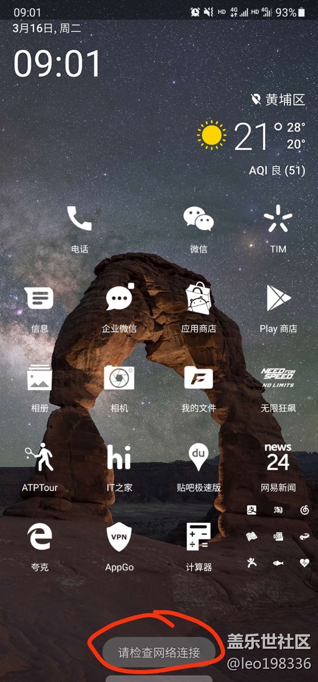 手機(jī)主桌面時(shí)不時(shí)彈出來"請檢查網(wǎng)絡(luò)連接",不定時(shí)出現(xiàn),并且只在主桌面上出現(xiàn)。一直沒搞明白這個(gè)提示到底是怎么出來的,和哪個(gè)軟件有關(guān)。今天截了個(gè)圖,大家看看是什么情況。