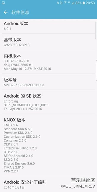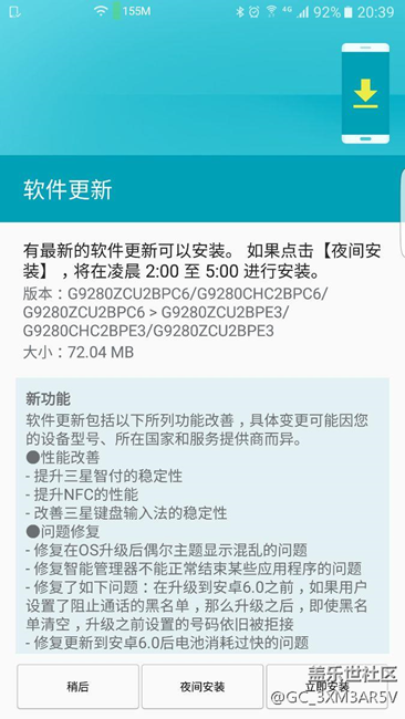剛剛更新了系統(tǒng)到MMB29K G9280ZCU2BPE3版本,介紹本次更新主要性能改善及修復(fù)系統(tǒng)升級(jí)到安卓6.0后電池消耗過(guò)快的問(wèn)題,具體還有待體驗(yàn)。
