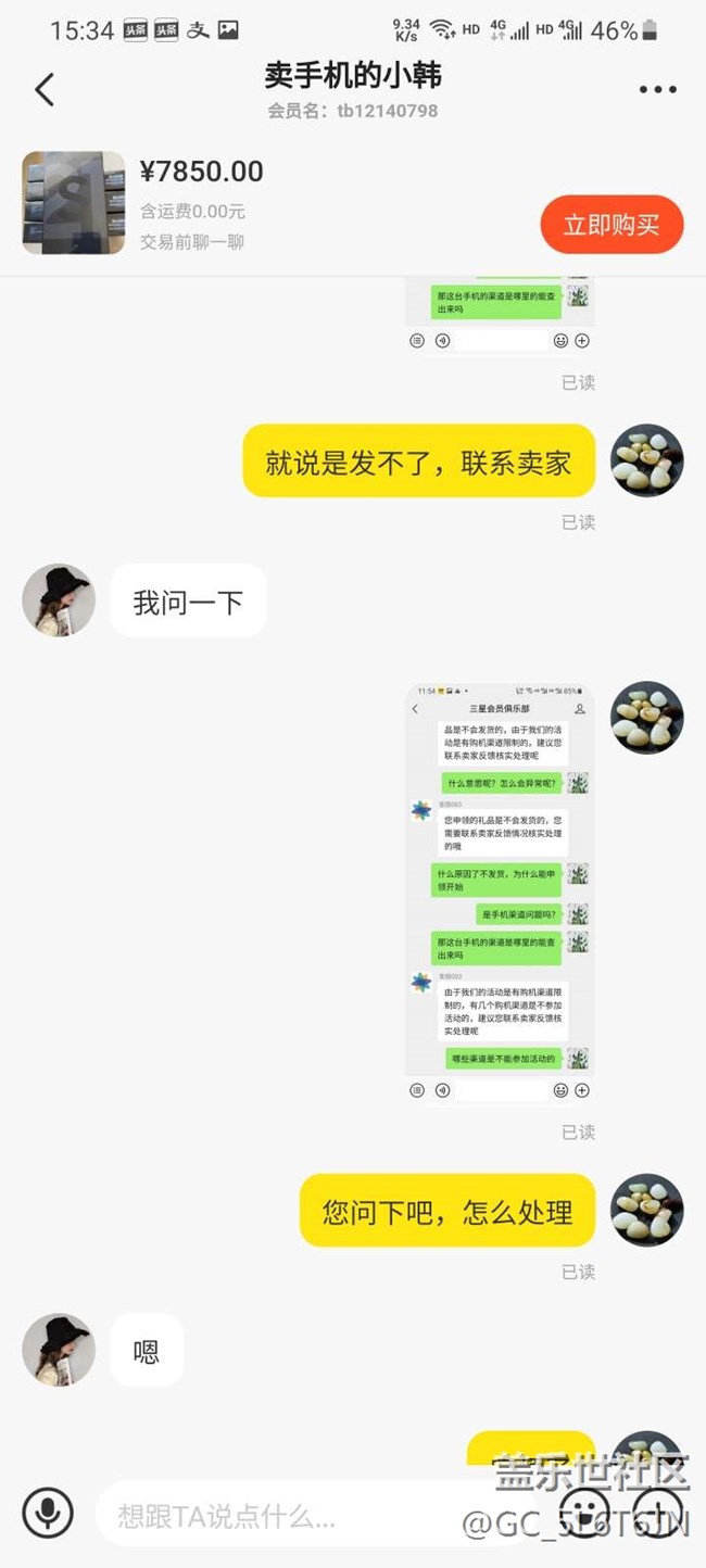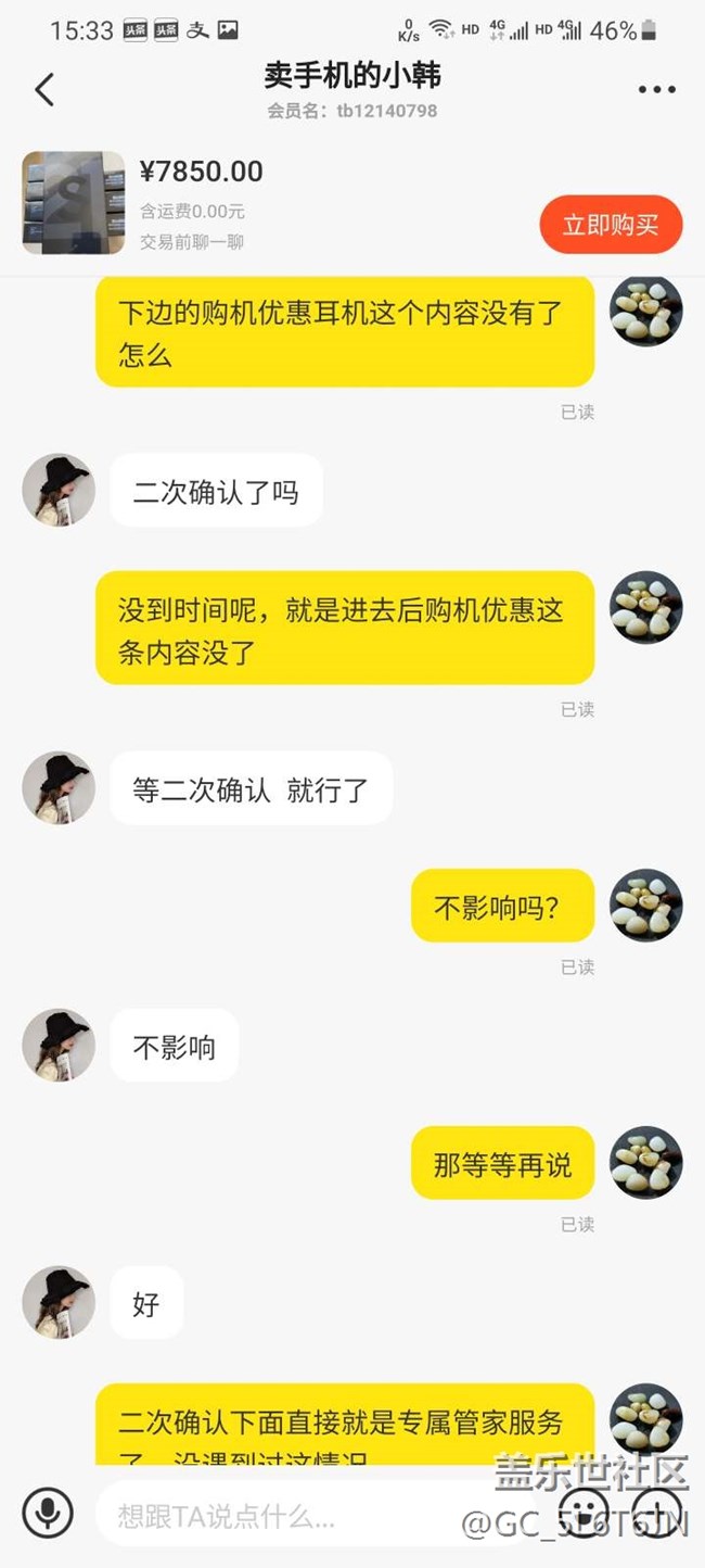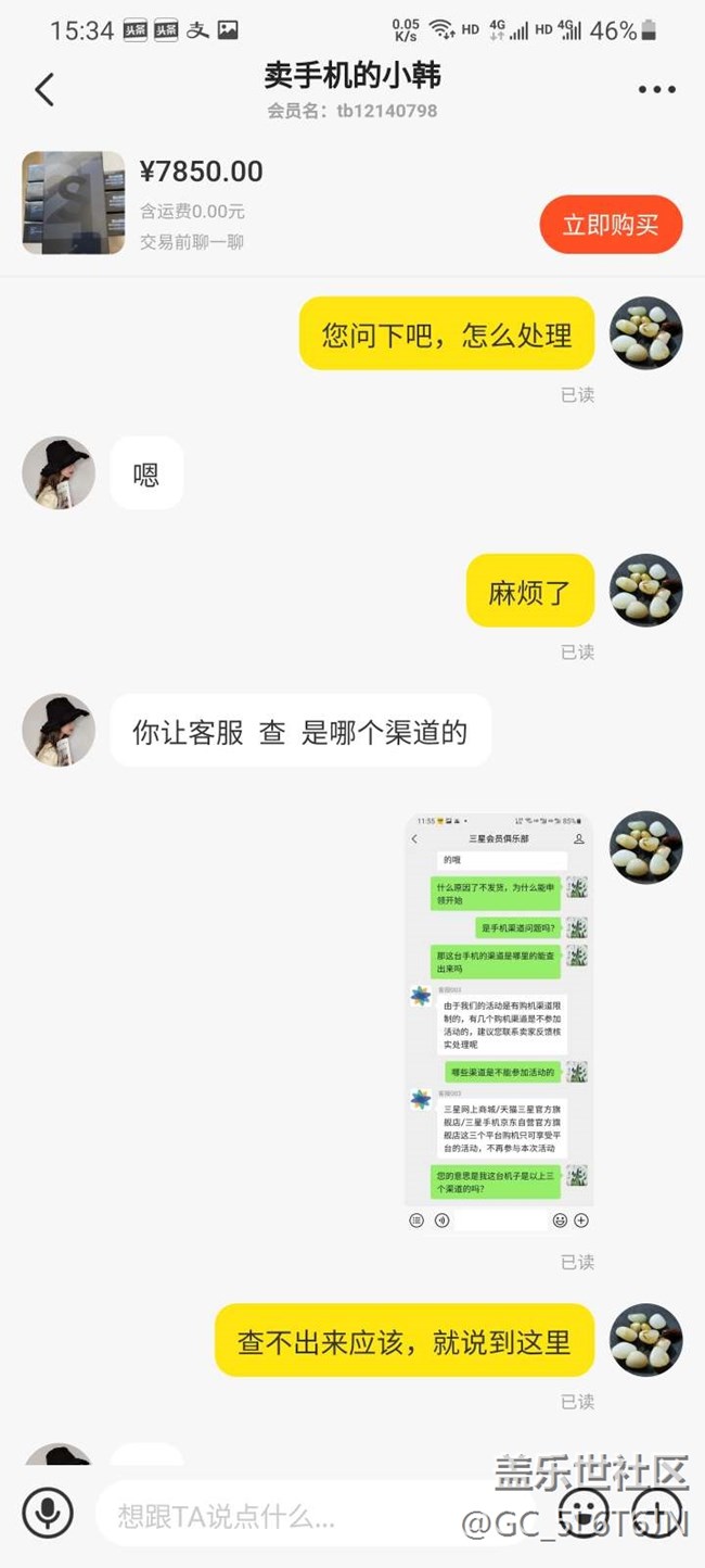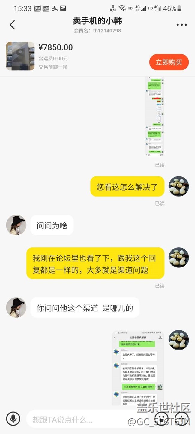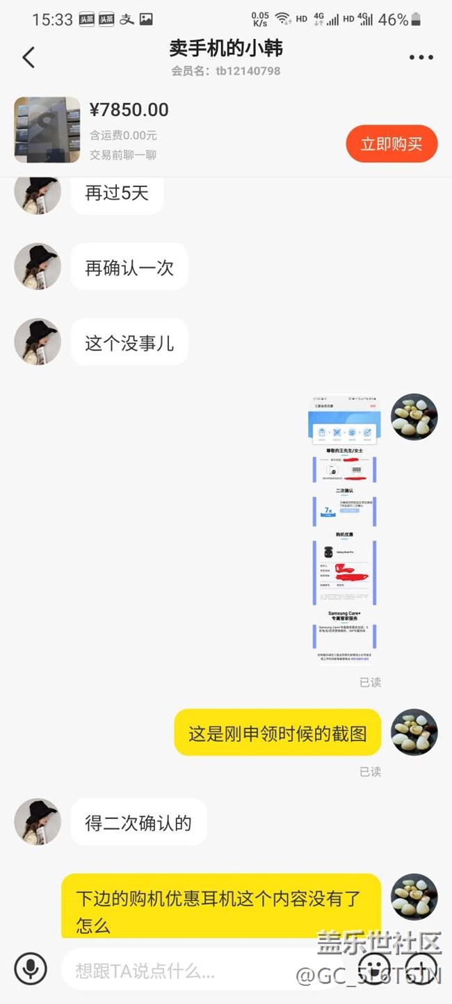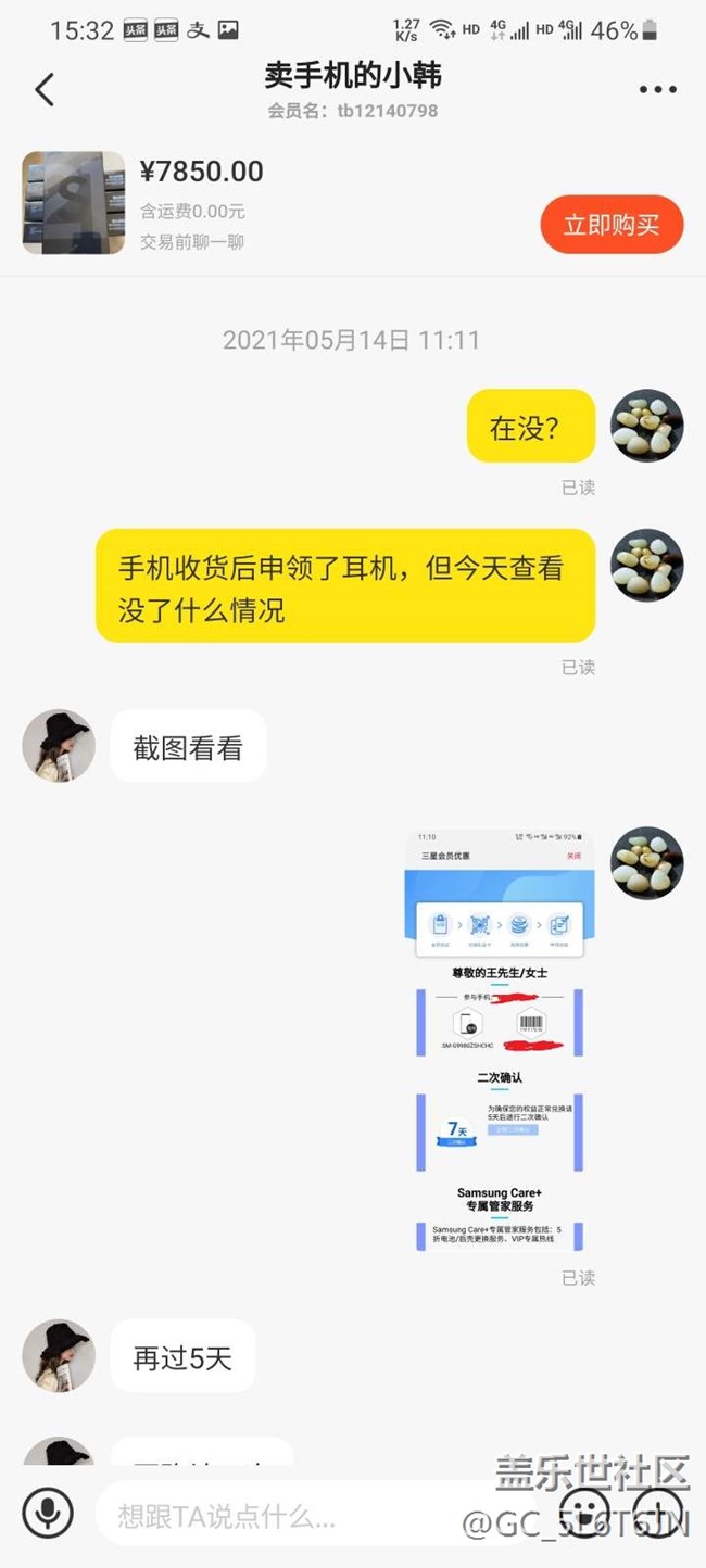手機是5月12日購買的,購買前和賣家確認好了可以領(lǐng)耳機,收貨后手機塑封來的,機器各個貼膜完好,序列號官網(wǎng)查詢未激活。于是自行開封激活手機,激活后第一時間進生活助手申領(lǐng)耳機,掃碼后顯示購機優(yōu)惠就是一個三星bbudspro無線耳機,直接申領(lǐng)完成,便直接確認付款。但兩天后再次登錄生活助手查看購機優(yōu)惠那個耳機信息沒有了,只剩下一個二次確認的信息,經(jīng)詢問三星客服,答復(fù)這臺手機渠道問題無法申領(lǐng),于是重新聯(lián)系賣家,目前賣家仍在給予積極溝通和協(xié)商,正在想解決辦法。也在這里咨詢下有無同樣經(jīng)歷的朋友,最后是怎么解決的。也是立此貼為據(jù),隨時更新后續(xù)情況,下面附上購買記錄和申領(lǐng)記錄,以免誤會。