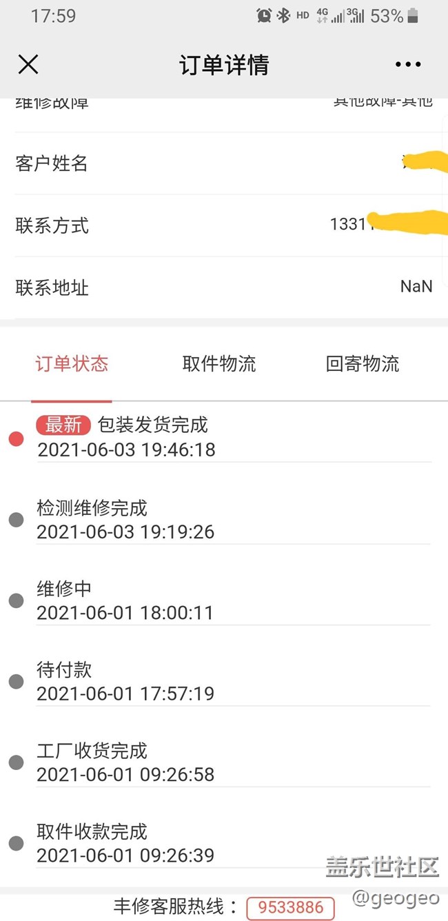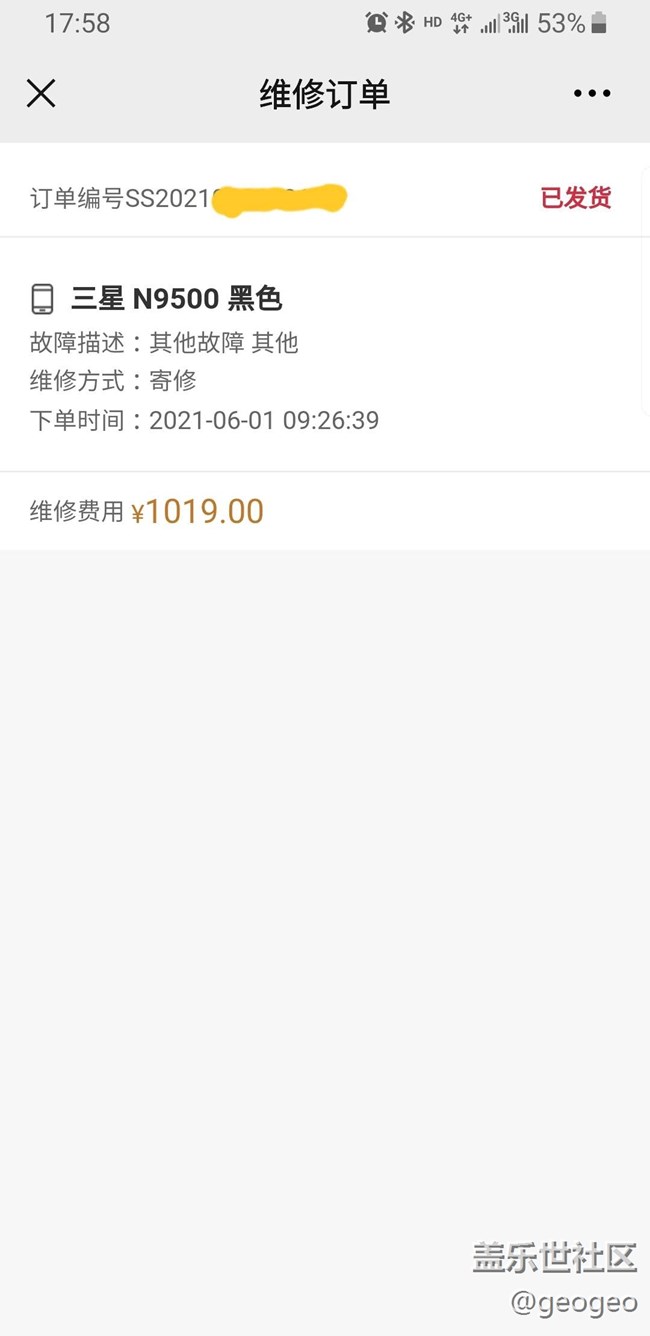 前不久終于把N8屏幕摔壞,于是官網(wǎng)上申請了集中換屏,按照集中換屏要求,將系統(tǒng)恢復(fù)出廠后以避免用個人信息泄露。兩小時后接到順豐小哥電話讓把手機送到門口,經(jīng)掃碼后簽字畫押等待消息。次日接到三星售后電話(其實就是順豐豐修公司),被告知手機收到,中框有劃痕、換屏899,同意就發(fā)短信鏈接付款云云……遂讓對方把電池也一并換掉,告知加120元即可。付款兩天后短信通知手機修復(fù)已發(fā)貨,次日一早順豐小哥電話告知取貨。