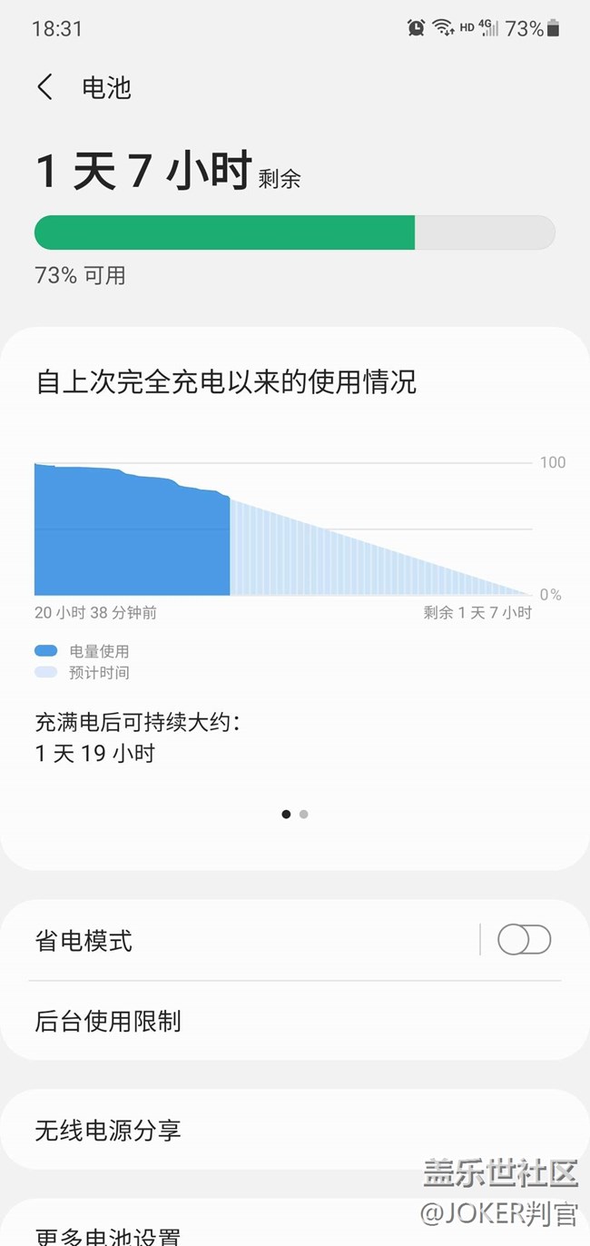 前一天晚上10點(diǎn)睡前充滿到100%,截止第二天下午18點(diǎn)剩余73%,2019年11月機(jī)器