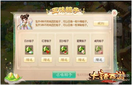 粽子可以在好友之間互相贈送,集齊5種味道粽子的玩家可召喚神秘粽子一枚,集齊4種味道粽子的玩家可召喚什錦粽子一枚