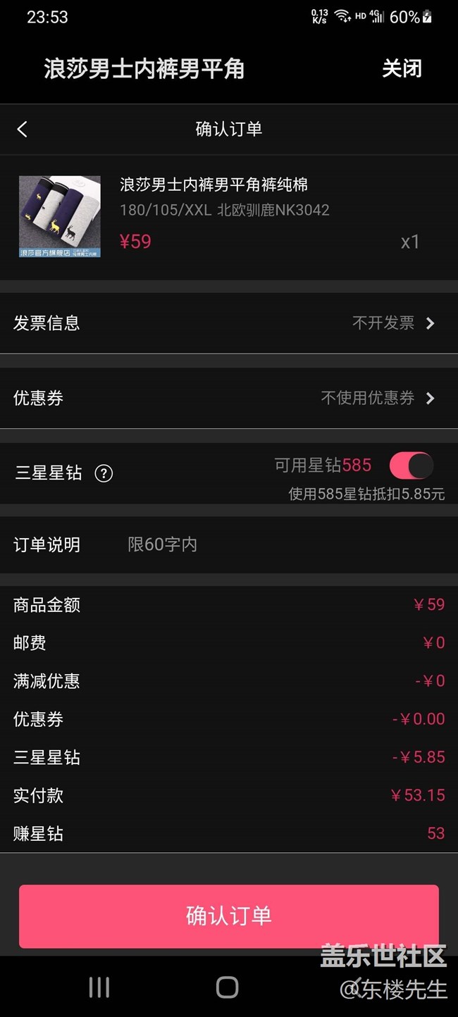 我努力不夠,近兩年只攢了585個(gè)星鉆,可以抵RMB5.85元。我找了差不多是最便宜的浪莎男士?jī)?nèi)褲準(zhǔn)備兌換。忽然我想去某東去看看賣什么價(jià)。不看不知道一看嚇一跳。用我攢下的585個(gè)星鉆在星商場(chǎng)兌換,抵扣5.85元后,標(biāo)價(jià)59元的四條裝內(nèi)褲我需要付款53.15元,看起來(lái)貌似真的優(yōu)惠了5.85元,星鉆真的值錢??赡銈冎涝谀硸|同樣的商品只要35無(wú)就可以買到手嗎?有截圖為證。