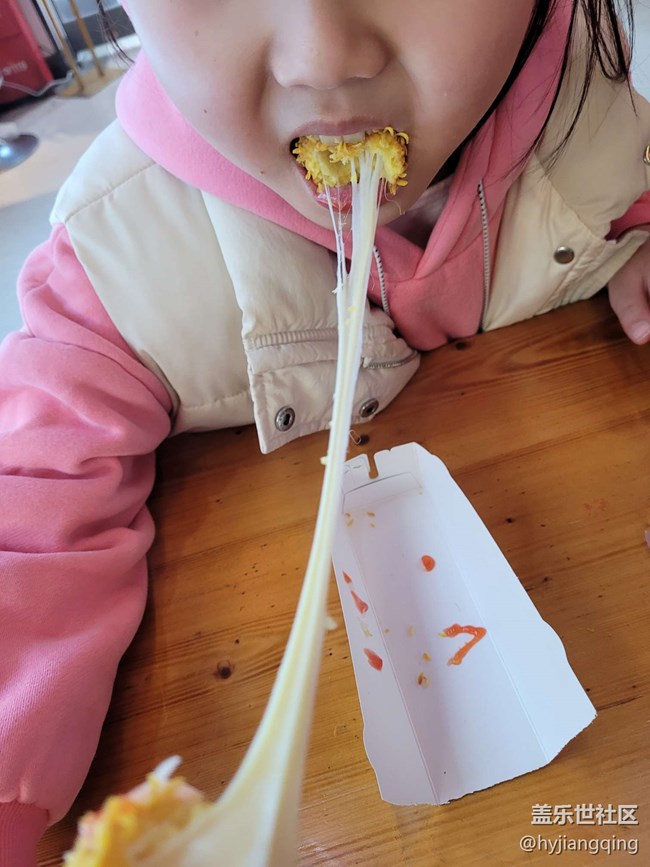 哈哈,說實話,味道一般吧,但是比較好玩,拉絲拉的不亦樂乎。上半截是芝士,下半截是火腿。
