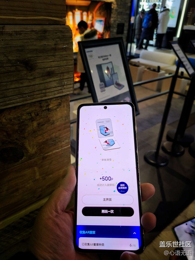 活動(dòng)的現(xiàn)場(chǎng)是用新款的三星手機(jī)。掃描現(xiàn)場(chǎng)的幾個(gè)指示牌,獲得積分,500個(gè)積分,可以抽一個(gè)真實(shí)的徽章,運(yùn)氣不錯(cuò),第1次就抽到了500積分,不過(guò)因?yàn)榭赡苁亲詈笠惶炝?,所以我抽到的三個(gè)徽章都是一樣的。