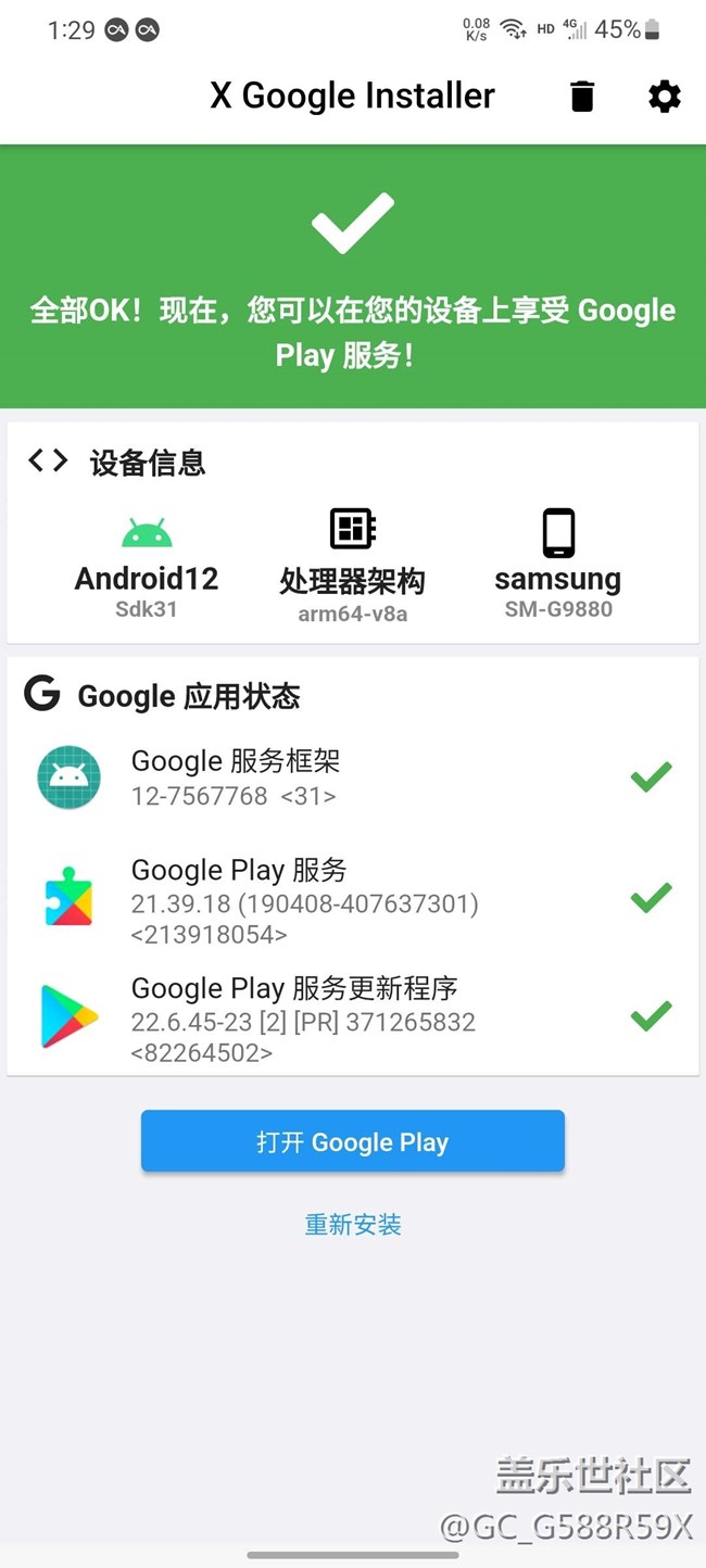 S20u應(yīng)該有谷歌商店呀,我之前s10+國(guó)行的還有,今天到手的s20u更新了安卓12就沒看見play商店呢?沒更新之前我也不知道有沒有,反正更新后沒看見play商店,軟件也沒在隱藏應(yīng)用中看見,去安裝三件套也顯示已經(jīng)安裝了,圖中點(diǎn)打開Google play的選項(xiàng)沒反應(yīng)。