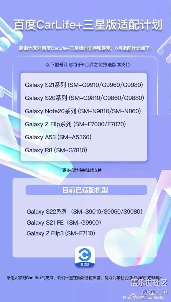 今日貼吧消息,Carlife+三星定制版6月適配機(jī)型,包括6個(gè)系列,12款機(jī)型。