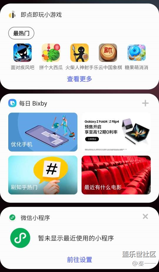 疫情期間需要頻繁亮健康碼,培養(yǎng)了我使用手機(jī)負(fù)一屏的習(xí)慣,用習(xí)慣之后,感覺負(fù)一屏確實(shí)能讓交互方便許多。拿三星S22 Ultra來(lái)說,除了能把健康碼、付款碼等高頻功能掛上,還可以直接掛上一些常用的小程序,應(yīng)用的打開更加直接。此外天氣、運(yùn)動(dòng)狀態(tài)等信息的顯示在負(fù)一屏上也要比在主界面更加詳細(xì)?,F(xiàn)在負(fù)一屏的聚合能力已經(jīng)非常全面強(qiáng)大了,用戶自定義的自由度也很高,用習(xí)慣之后一個(gè)界面能滿足所有需求,感覺廠商可以考慮在折疊屏的外屏上統(tǒng)一顯示負(fù)一屏。