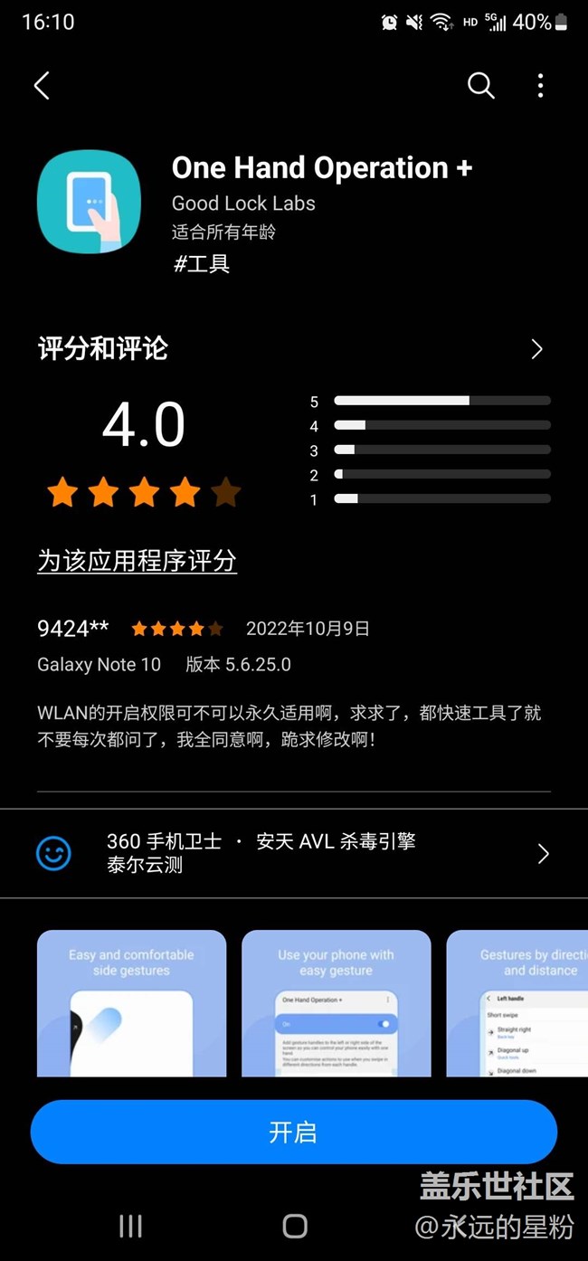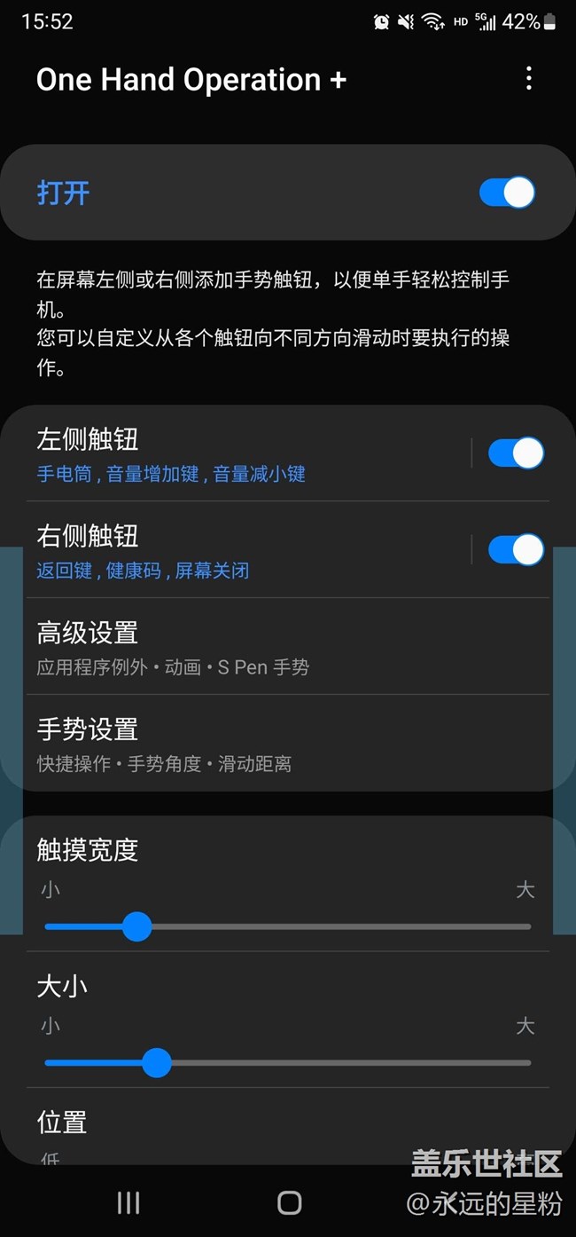 One Hand Operation+ 是一款專門為三星用戶打造的全面屏手勢軟件,這款軟件可以自定義手勢操作區(qū)域大小,提供了六種簡單的操作手勢,讓如今的大屏手機也能單手操作,提高了便捷性!三星這個插件可自定義手勢操作的區(qū)域大小,位置、滑動長度,共有六種手勢:橫向,斜上,斜下,都分長短兩種劃動。除了完全代替三個虛擬鍵以外,還可以一鍵鎖屏。更多操作請自行探索。通過此軟件與三星曲面?zhèn)绕料嗯浜希艽蟠筇岣卟僮餍省?/font>大家可以去三星應(yīng)用商店下載,讓你手機開啟一個新世紀(jì)