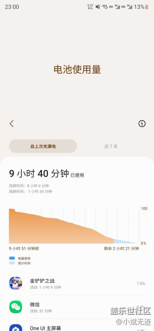 續(xù)航:作為一個(gè)從Note3一直使用三星產(chǎn)品的用戶,續(xù)航有很明顯的感知變強(qiáng)了(當(dāng)然可能至少快跟普通友商一樣的水平吧),比我的Tab S8+續(xù)航都好,就看能不能繼續(xù)保持下去,畢竟才用了一周,圖片一個(gè)全室內(nèi)環(huán)境使用,一個(gè)全戶外環(huán)境時(shí)候續(xù)航情況。