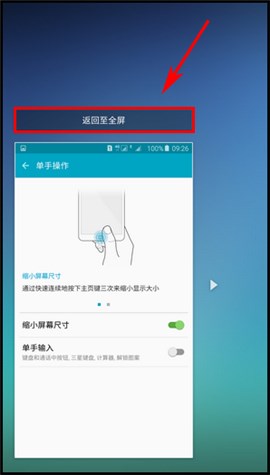第三步:快速連續(xù)的按下【主頁(yè)鍵】三次可以縮小顯示大小,點(diǎn)擊【箭頭】圖標(biāo),可以將單手操作屏幕調(diào)整至左側(cè),反之亦然,點(diǎn)擊【返回至全屏】,即可返回全屏視圖。