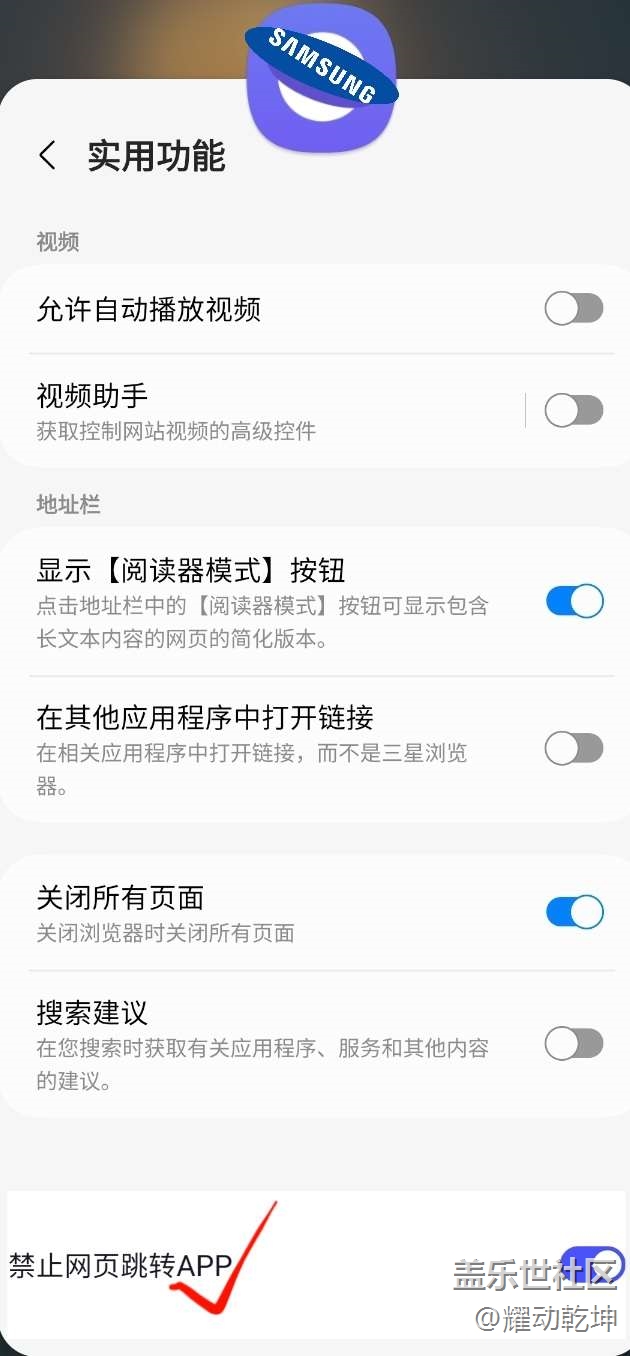 帖子名稱 請盡快在【三星瀏覽器】中添加【禁止網(wǎng)頁跳轉(zhuǎn)APP】功能