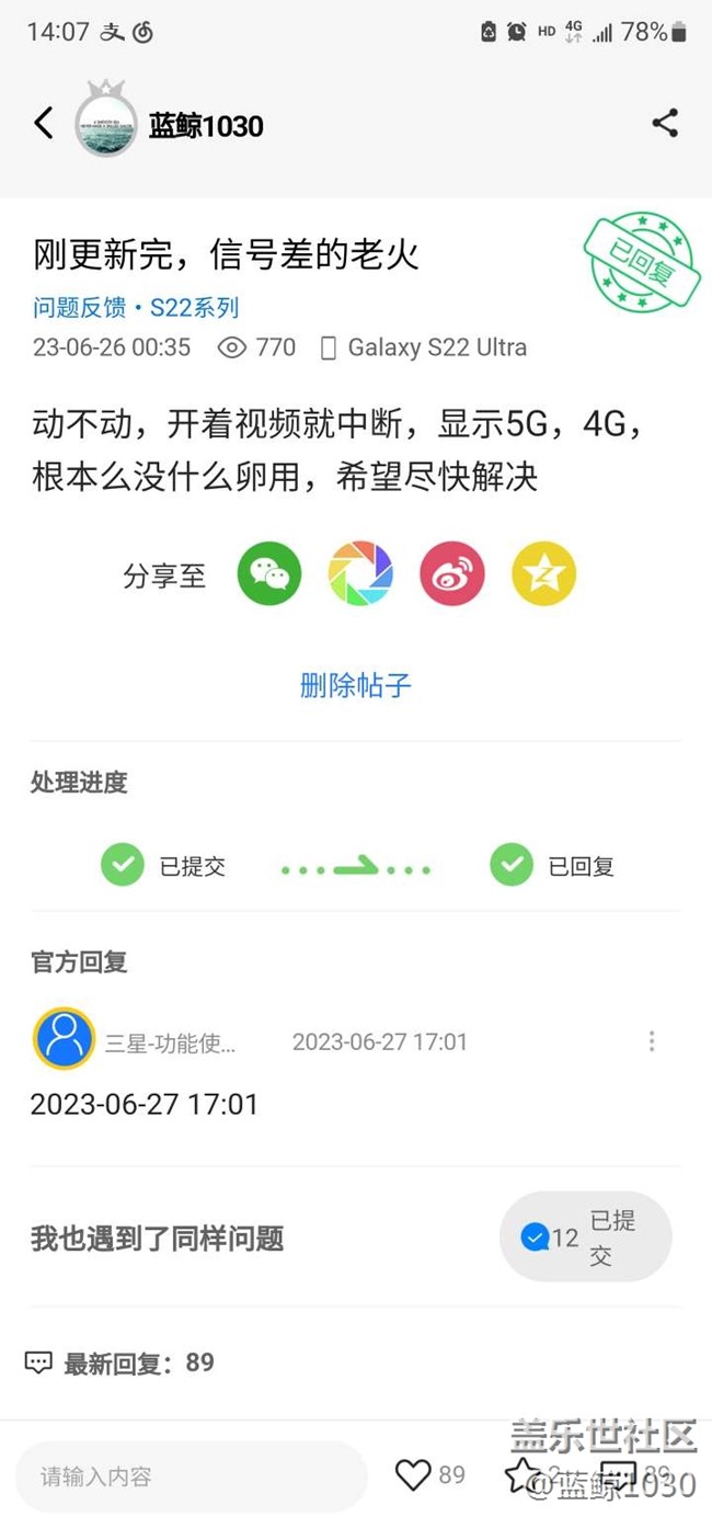 帖子名稱 官方敷衍了事,啥也沒回,S22u信號差到爆