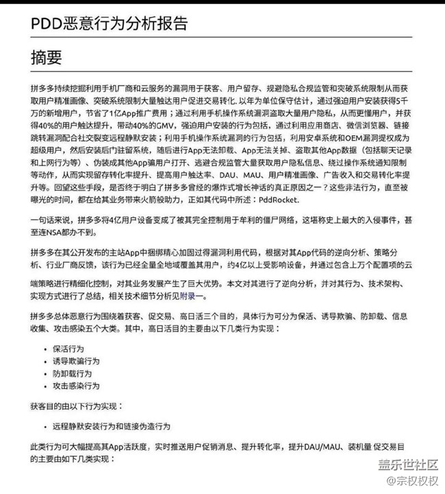 卡巴斯基安全研究員IgorGolovin表示:“拼多多應(yīng)用程序的某些版本包含惡意代碼,這些代碼利用已知的Android漏洞來提升權(quán)限、下載和執(zhí)行其他惡意模塊,其中一些模塊還可以訪問用戶的通知和文件?!辈悸〔?。
