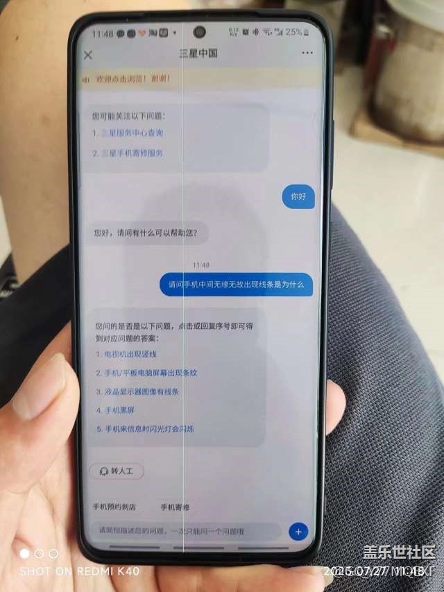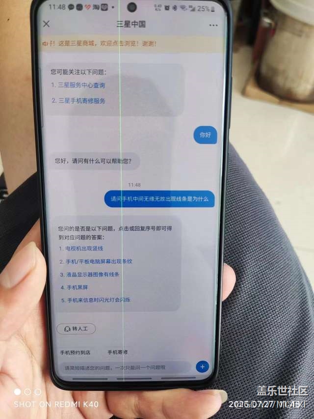 7月26號早上醒來一開手機出來一條綠線,本來以為關機重啟能好,結果不行,于是去了貼吧看到好多機油都出現了,這是三星品控問題,于是聯系客服,客服讓送去檢測,發(fā)去檢測中心,大慨一個多星期打電話通知我,說是屏幕問題要換屏幕,當時還說快充沒有了。我發(fā)出去之前都還有的快充,讓你檢測一下就沒了?讓我出130元人工費,無奈,人小式微,只能點頭同意,然后當天晚上手機就已經發(fā)出,隔天拿到手機發(fā)現充電快充果然已經沒有了,真的納悶了明明送去之前還有的,修一下就沒了?這就算了,然后還發(fā)現前置攝像頭里面出現一個東西,在屏幕里面,也清不掉,就這技術,村口老大爺都比你技術好,本來家里人用的都是三星,現在不會再考慮一下,換果子了,真的勸退及時,差點下單23U,本來已經再看了還好勸退及時
