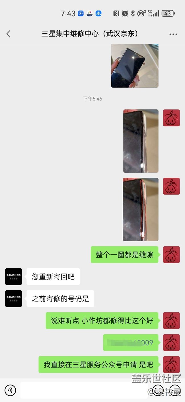 9月2號送去重慶北城天街售后,售后說需要返廠,歷時一個多星期 今天去售后取機(jī)器,發(fā)現(xiàn)外屏拆開重新安裝之后 四周全是縫隙 還有殘膠,我當(dāng)時就表示我不接受,拒收,售后工作人員說叫我自己聯(lián)系400或者名片上面的聯(lián)系方式,我加了名片上二維碼說明了情況。三星返廠維修就這水準(zhǔn)嗎?甚至不如街邊維修點(diǎn),對了 返廠返的是武漢京東的集中維修站,一點(diǎn)都不專業(yè),給我打電話過來都是京東客服打的,圖片里的名片就是隨著機(jī)器一起寄回來的。我就納悶,我看網(wǎng)上視頻 維修鉸鏈?zhǔn)遣饍?nèi)屏呀,怎么把我外屏給拆了,一萬多的手機(jī),修成這個鬼樣子。