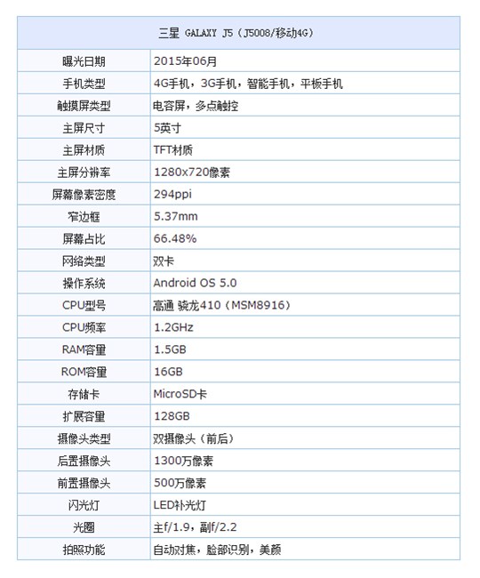 三星Galaxy J5正面配備了一塊5寸1280x720像素的5英寸HD高清屏幕,讓更多的精彩載入你的“視”界。并且擁有1.5GB內存以及8GB存儲、1300萬后置以及500萬像素攝像頭,硬件上搭載強大的四核1.2GHz處理器,配合最新的安卓5.1操作系統(tǒng)、與旗艦Galaxy S6同款的操作界面,更快的網(wǎng)頁搜索和更順滑的UI轉換,讓用戶充分享受操作的快感。