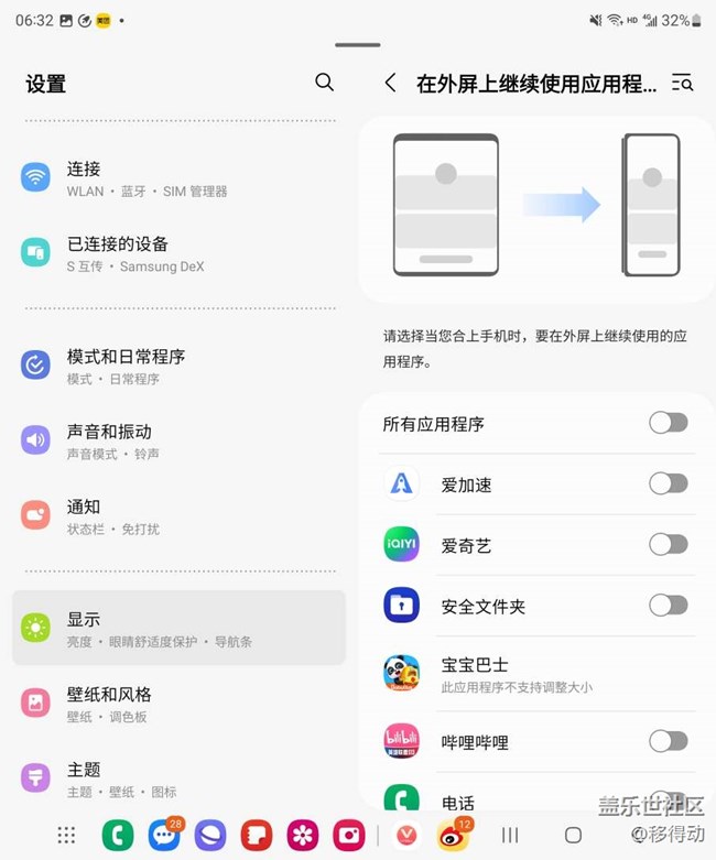 分享下三星Galaxy Z Fold4 5G的外屏個性化設(shè)置,主要是關(guān)系到大家日常的使用體驗,首先是【在外屏上繼續(xù)使用應(yīng)用程序】這個功能還是比較實用的,當(dāng)我們在大屏幕狀態(tài)下使用后需要折疊時,我們可以根據(jù)自己需要在設(shè)置-顯示中打開在外屏上繼續(xù)使用應(yīng)用程序即可。