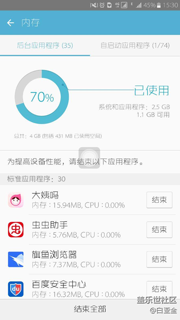 麻煩三星你們處理下,所有的APP,開機(jī)了全部后臺運(yùn)行,退出超級省電有,開機(jī)有,一鍵優(yōu)化有。煩死了,麻煩你們處理下,手機(jī)快炸了,燙死了。