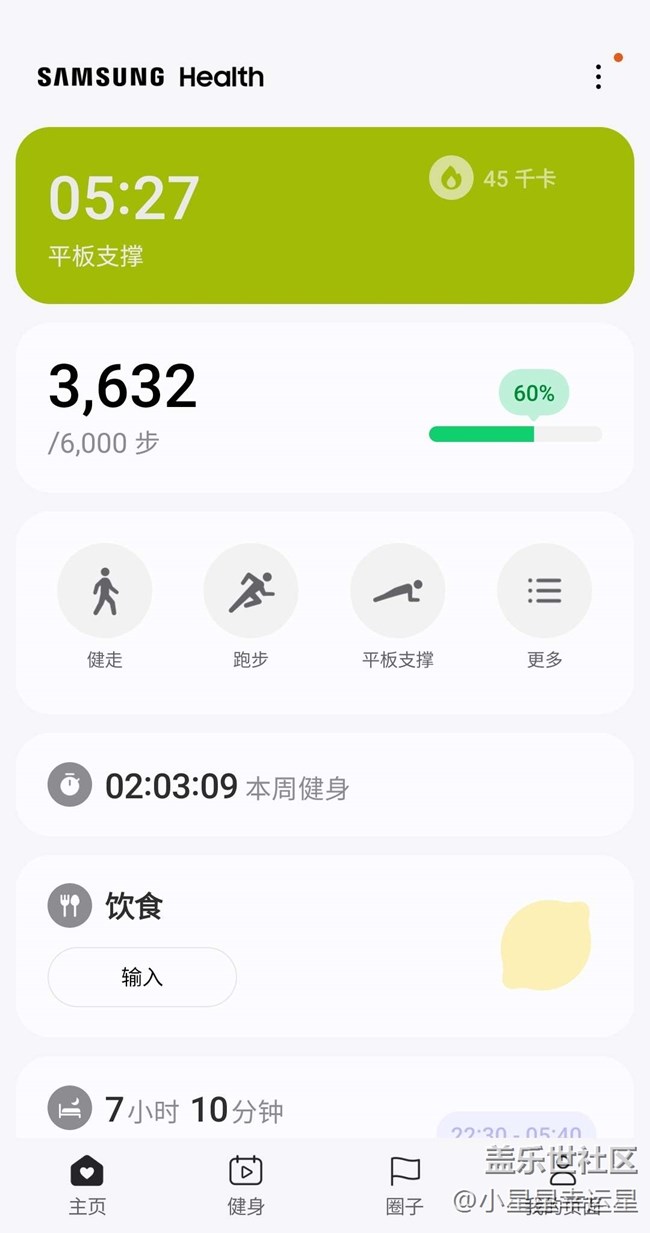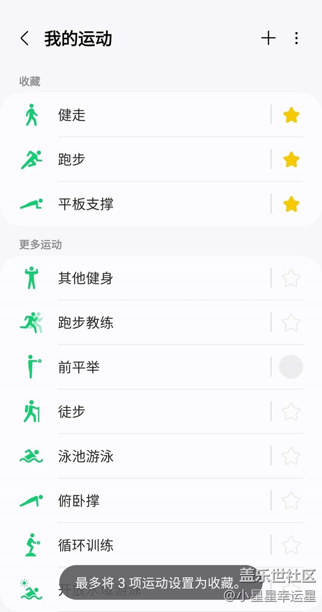三星健康首頁可以找到三星運動,可以選擇三項你個人最喜歡的運動作為快捷方式!