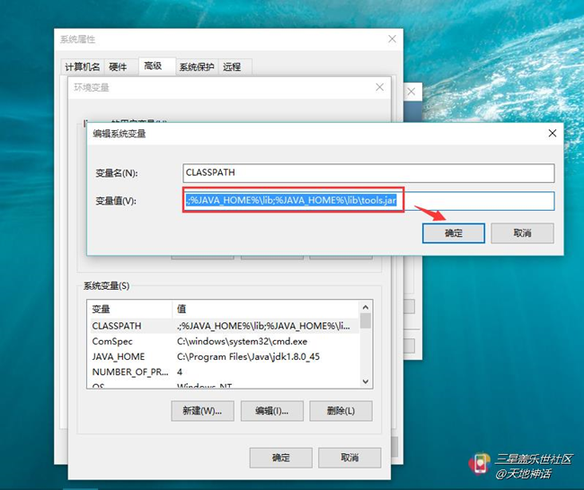 在系統(tǒng)變量里點(diǎn)擊新建變量名填寫CLASSPATH,變量值填寫“.;%JAVA_HOME%\lib;%JAVA_HOME%\lib\tools.jar”。注意不要忘記前面的點(diǎn)和中間的分號(hào)。