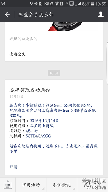 連續(xù)3天搶s碼,終于搶到了。但是看到官網(wǎng)商城先鋒版是預(yù)售,心里還是有點小小的難受的,本以為能象之前s7edge的s碼活動一樣能夠提前拿到。沒辦法了,只好稍微等一下,不知道31號前是否能到手。我覺得官網(wǎng)最好能表示一下慰問,不要讓我們這些星粉失望了。不多說,先上圖。