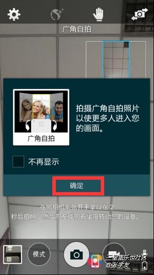 二、在點(diǎn)擊“廣角自拍”之后會(huì)有要關(guān)協(xié)義說明,我們點(diǎn)擊確定之后再點(diǎn)擊照相機(jī)按鈕。
