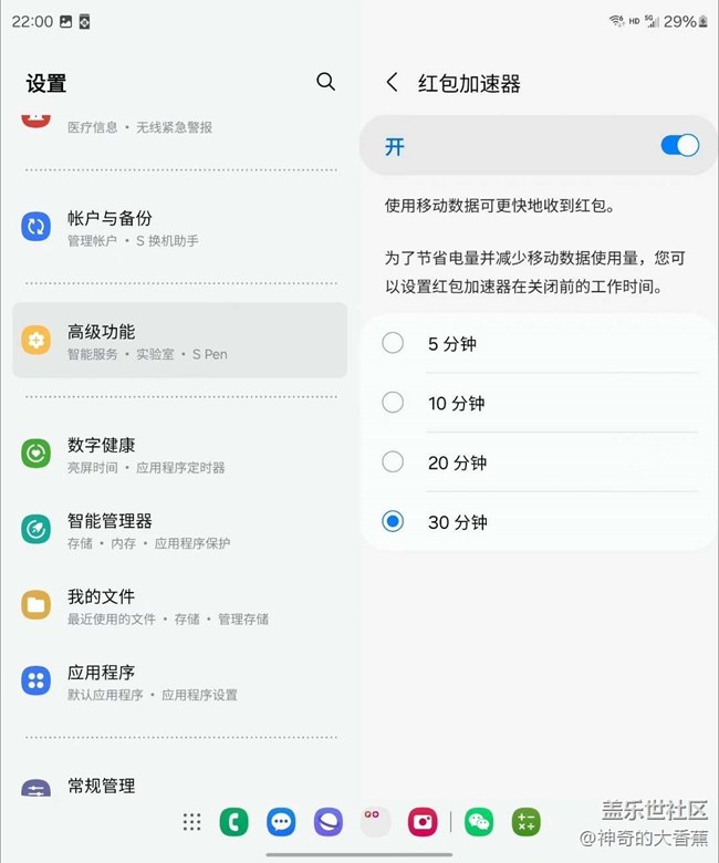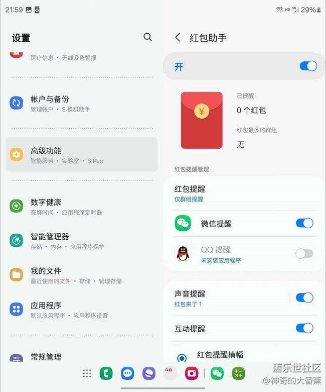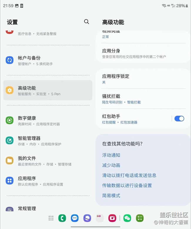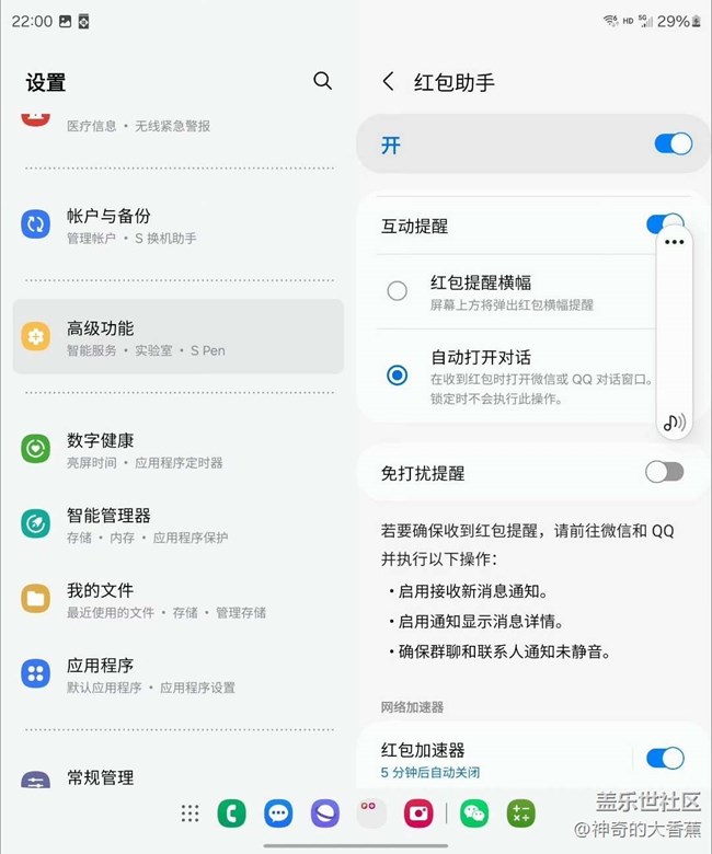 誰(shuí)不喜歡紅包雨呢?來(lái)來(lái)來(lái),今兒咱們聊聊三星Z-Fold5里的紅包助手神器,真心建議大家給它開個(gè)綠燈!這玩意兒不光能給你彈個(gè)紅包提醒的小橫幅,還能自動(dòng)跳轉(zhuǎn)到聊天窗口,搶紅包那叫一個(gè)手到擒來(lái),輕松加愉快。