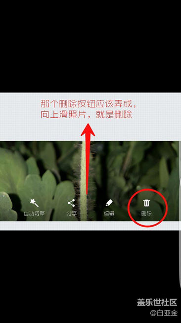 每次在全屏模式下瀏覽圖片,看到不想要的圖片,想刪除,還要去點(diǎn)一下照片,才彈出刪除按鈕。相比起向上滑動(dòng),就顯得不方便,并且還隨時(shí)不小心再觸碰到照片,刪除按鈕又沒在了,又要得再一次點(diǎn)圖片。