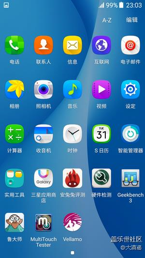 主界面采用了二級菜單,程序圖標采用扁平化風格。同時因為Galaxy On7為5.5寸大屏幕,應用菜單的排列方式增大為5x5,可以在一頁上顯示更多的應用。