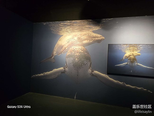 再下面是座頭鯨,位于下面的是座頭鯨媽媽,上面的是它剛出生不久的孩子。座頭鯨媽媽產(chǎn)仔后會帶著它的孩子一起進(jìn)行海底遷徙。