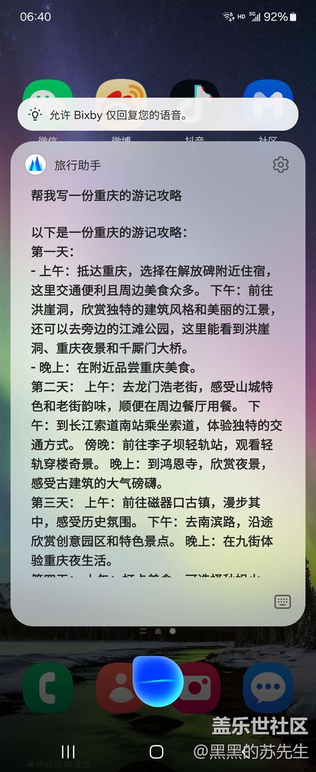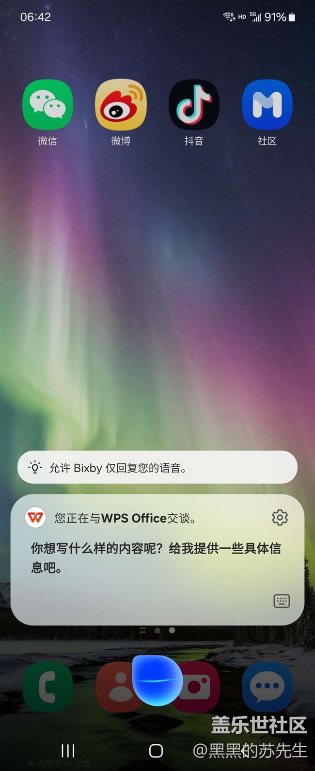 首先在三星手機中打開WPS Office應(yīng)用,創(chuàng)建一個新的文稿,然后喚醒Bixby,通過語音輸入想創(chuàng)建PPT的主題,接著Bixby會自動給出具體的文案方向。
