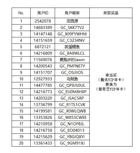 在所有猜中Miss星空間活動(dòng)冠軍的用戶中隨機(jī)抽取幸運(yùn)獎(jiǎng)20人,每人獲得騰訊VIP年卡一份