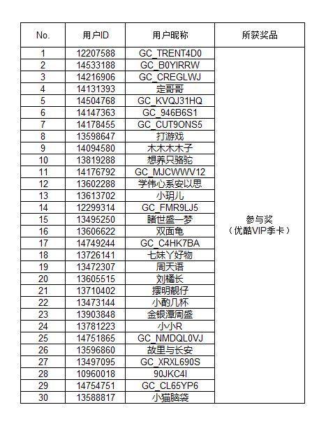 在所有參與投票的用戶中隨機(jī)抽取參與獎(jiǎng)30人,每人獲得優(yōu)酷VIP季卡一份