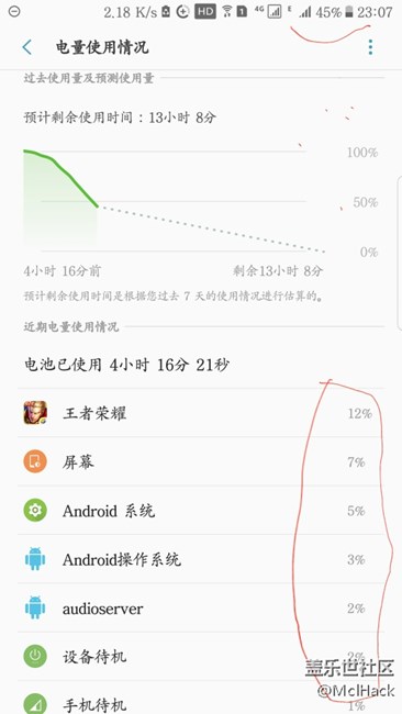 大家看,我的耗電列表耗電加起來都算不夠我的電池總量,我手機電池的電是怎么沒的??加起來才是百分之32,再加剩余45共計77,我的其余百分之20電量去哪了??
