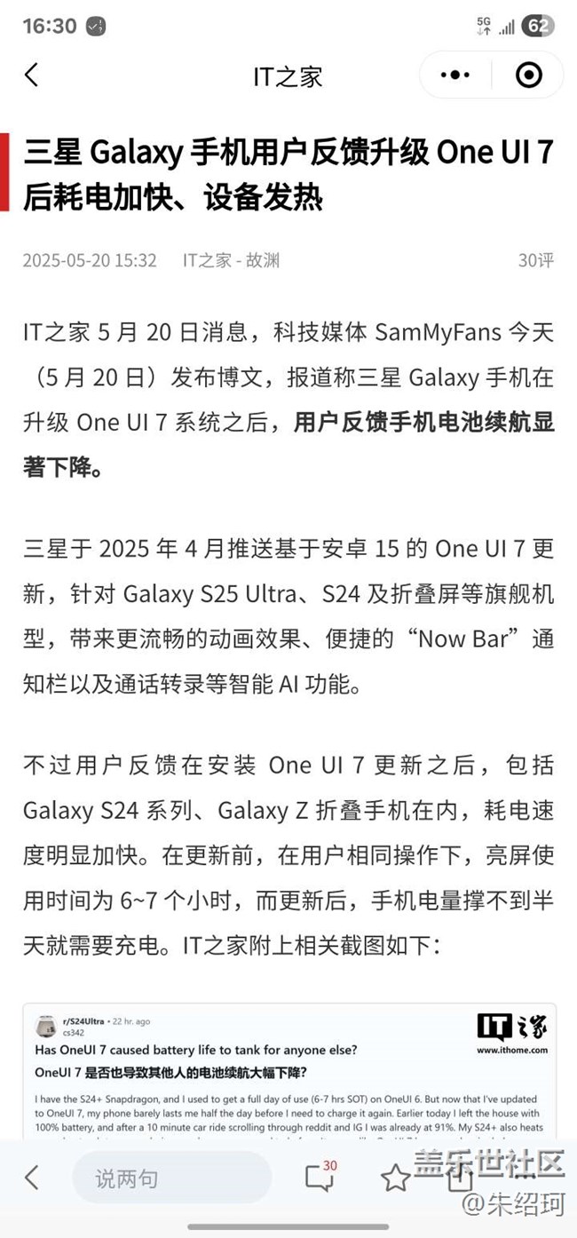 IT之家報道,更新One UI7后耗電加快,設(shè)備發(fā)熱
