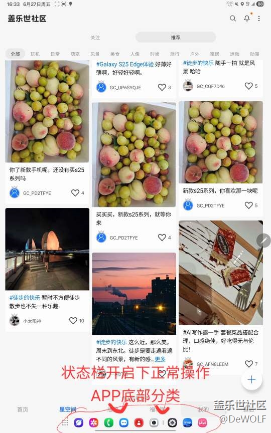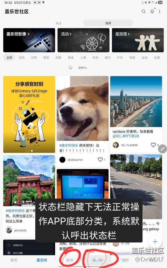 iPadmini和S10fe,選了這個現(xiàn)在用起來真心不順意。社區(qū)全屏模式狀態(tài)欄隱藏使用的時候,無論是用手或者筆???操作底下分類欄都無法成功,第一反饋是激活呼出隱藏的狀態(tài)欄,什么鬼操作,調(diào)整成始終顯示狀態(tài)欄模式下,社區(qū)APP整個界面縮小,底部分類欄就可以正常操作了。