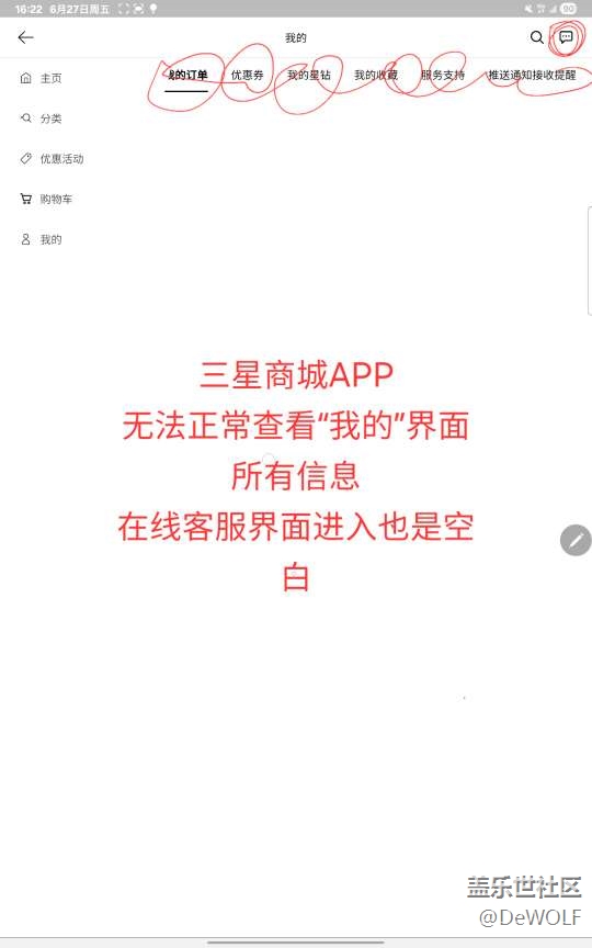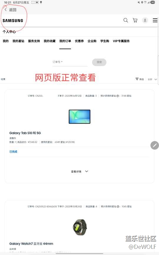 另外平板上的三星商城APP登錄查看我的:個人星鉆,訂單記錄,人工界面都無法顯示,打電話也不曉得解決方法?但是從社區(qū)網(wǎng)頁版登錄查看又都是正常的,哎!長點心吧!